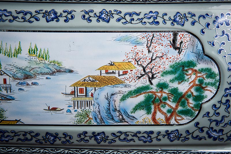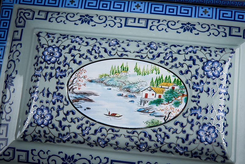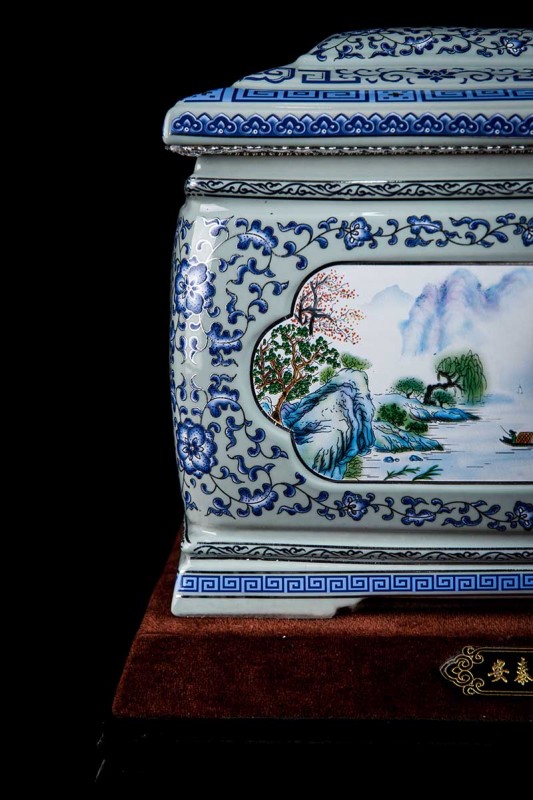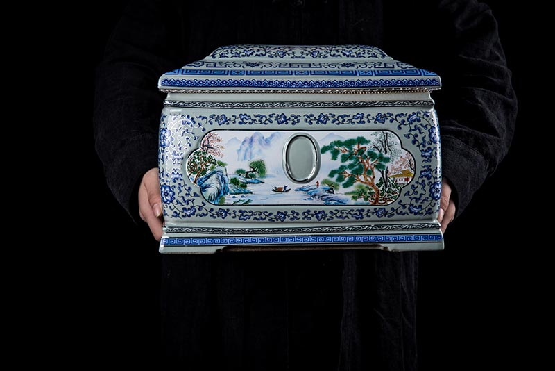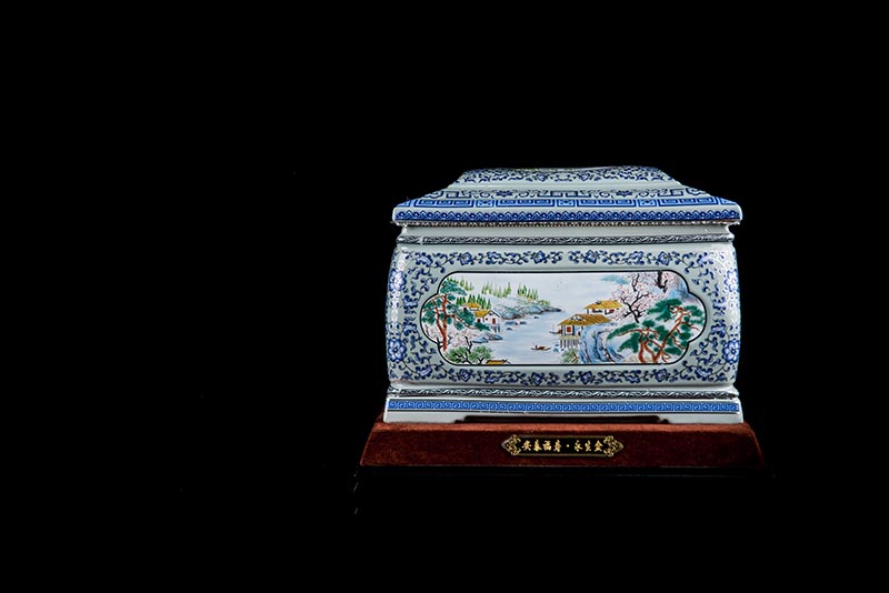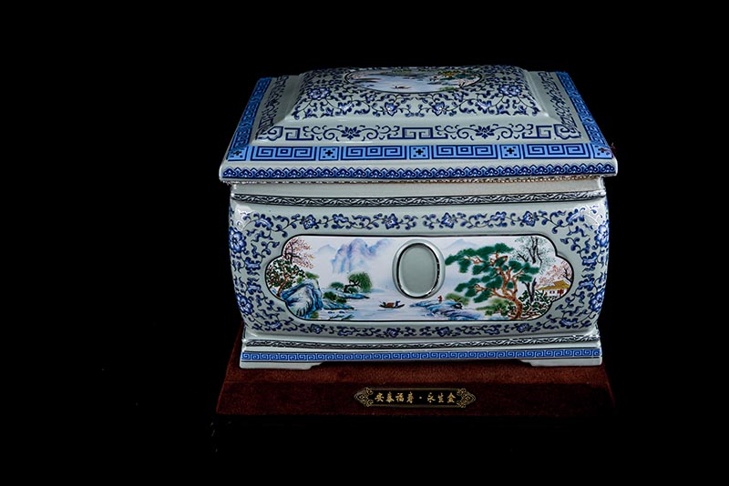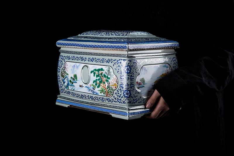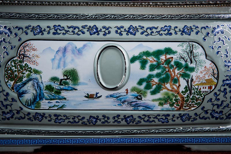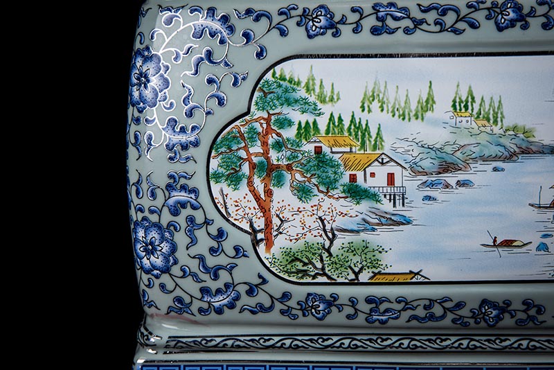這款產(chǎn)品采用了青花粉彩工藝,既有景德鎮(zhèn)具特色的青花,又有山水,景德鎮(zhèn)民間稱之為“開窗山水”很多工藝品都會(huì)運(yùn)用上,讓許多文人墨客忍不住注目觀看。我們可以看到這款產(chǎn)品圖片上青花與山水搭配巧妙,纏枝蓮紋環(huán)環(huán)相扣,寓意后世枝繁葉茂,代代繁榮。尺寸:340x230x250mm